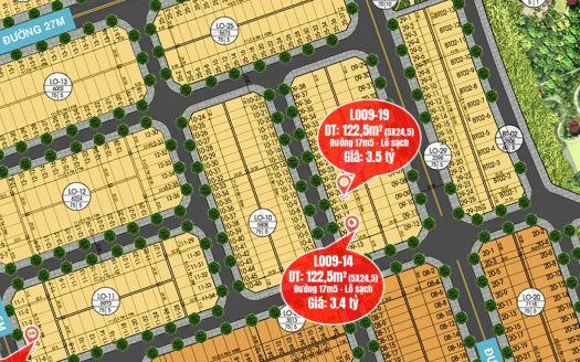 *Mã lô: LO09-14 *Diện tích: 122,5m² (ngang 5m, dài 24,5m) *Hướng: Tây Nam *Vị trí: Lô đất sát sông Cổ Cò, gần Đại h [hơn]
